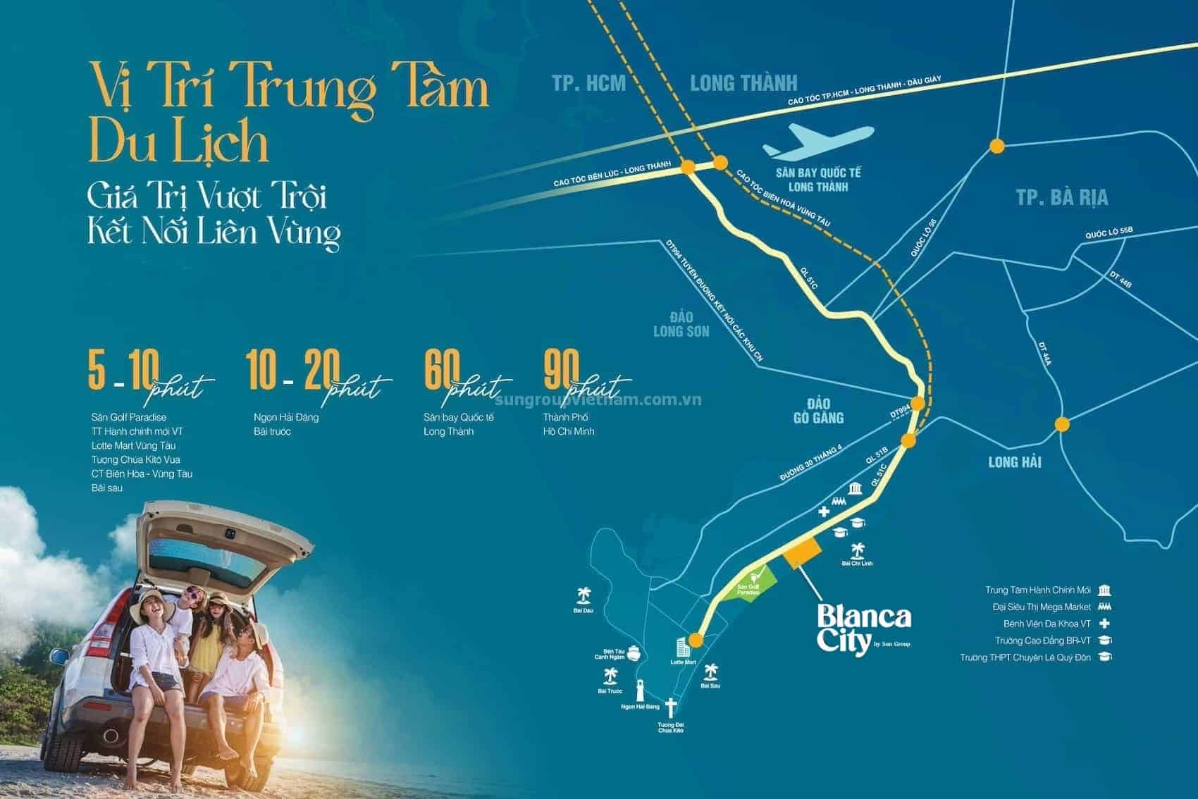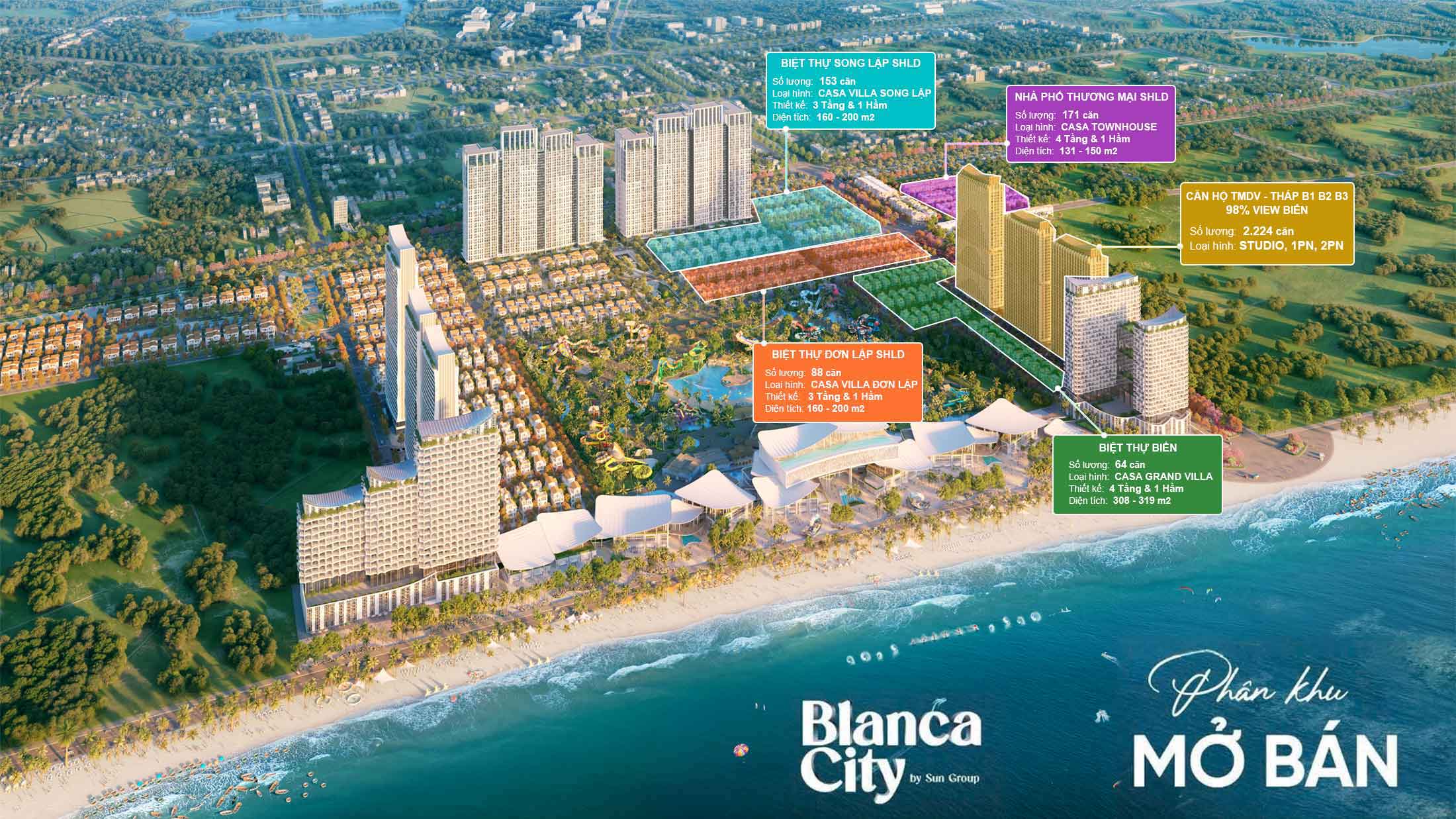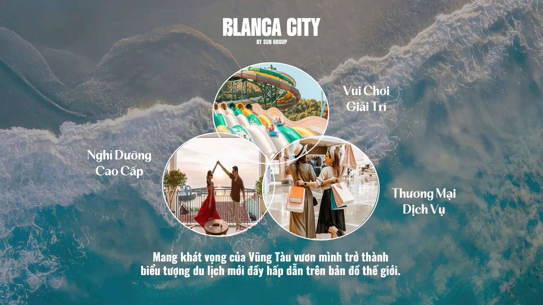 Dự án Blanca City Vũng Tàu là siêu đô thị biển đẳng cấp do Tập đoàn Sun Group phát triển, tọa lạc tại vị trí kim cương trên trục đường 3 Tháng 2, thuộc phường 10 và 11, TP. Vũng Tàu, tỉnh Bà Rịa – Vũng Tàu. Với quy mô 96,6 ha và tổng vốn đầu tư khoảng 37.000 tỷ đồng, dự án được định vị là biểu tượng sống mới, kết hợp hài hòa giữa an cư, nghỉ dưỡng và giải trí theo mô hình “All-in-One” chuẩn quốc tế. Blanca City là mảnh ghép hoàn hảo trong bức tranh phát triển tổng thể của thành phố biển Vũng Tàu. Dự án được kiến tạo với tư duy phát triển đa chiều: từ du lịch nghỉ dưỡng thượng lưu, đến không gian sống tinh hoa, từ trung tâm thương mại phồn hoa đến không gian công cộng mở đẳng cấp.
