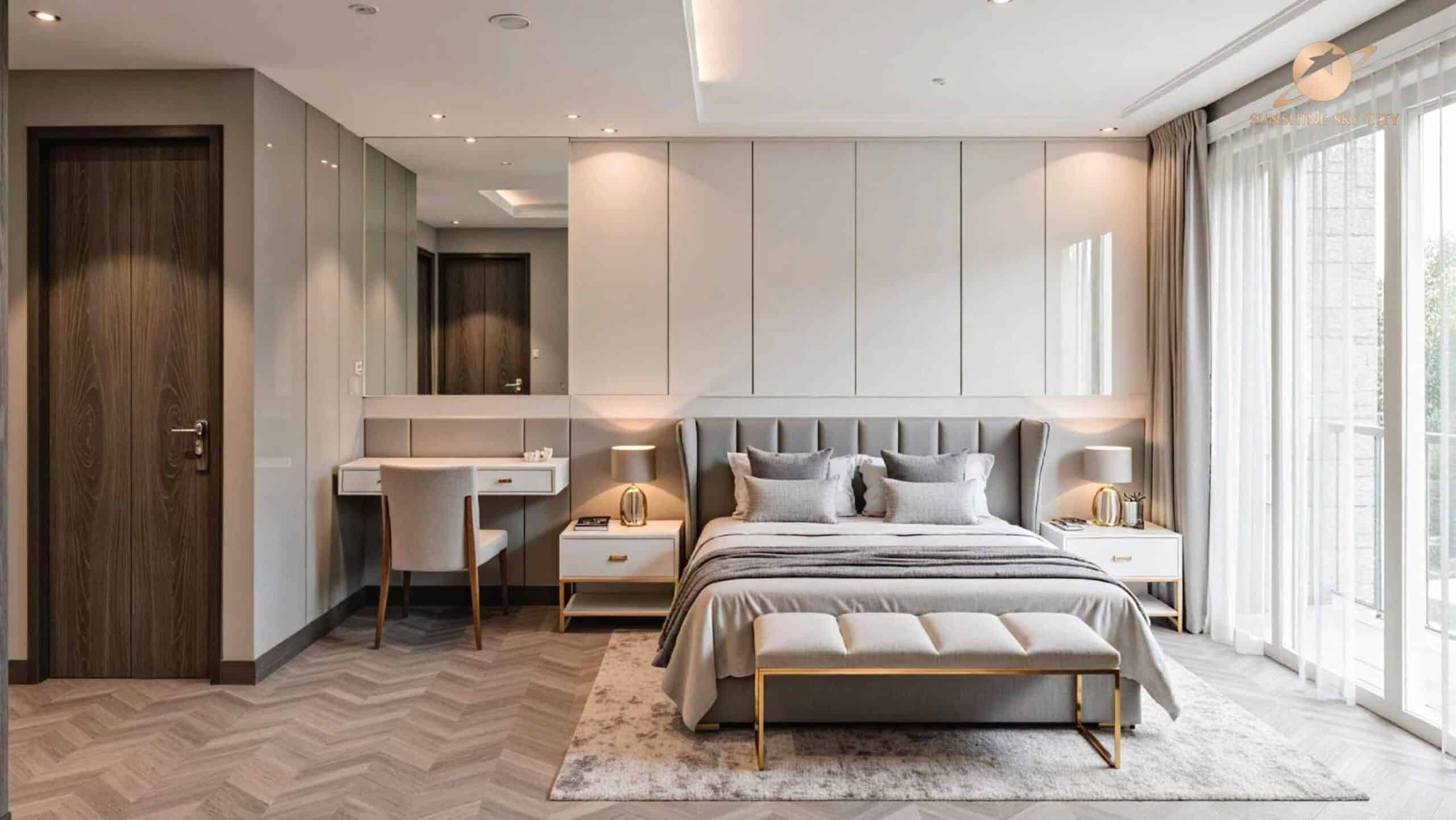 Tủ âm tường (phòng ngủ chính) Gỗ MDF chống ẩm, phủ Melamine vân gỗ, ray giảm chấn Blum (Áo)